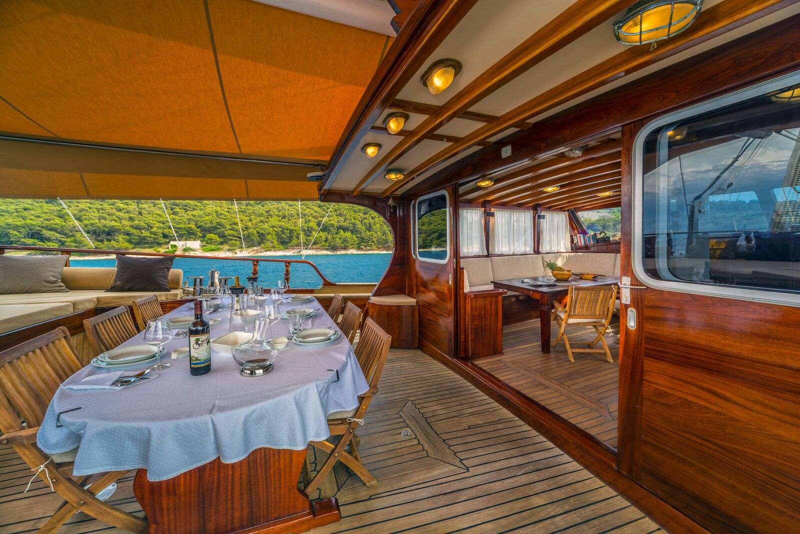 INTERIOR The interiors exude warmth, with traditional wooden styling and nautical details. The main salon is bright and spacious, featuring panoramic windows, comfortable lounge areas, and a dining space. The 2025 refit brought a fresh, modern touch while preserving her classic elegance.
