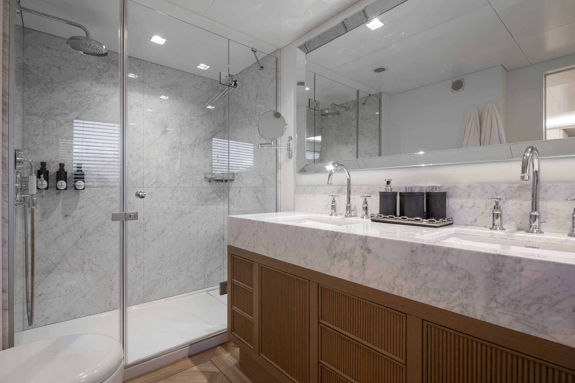 ONBOARD ACCOMMODATION The yacht accommodates up to 12 guests in 6 luxurious cabins. The Owner's Suite offers panoramic sea views, combining elegance and comfort. Additional cabins include 1 Master Suite, 1 VIP Suite, and 3 spacious Guest Suites with king-size beds. Each cabin features ensuite facilities and elegant interiors for ultimate relaxation.