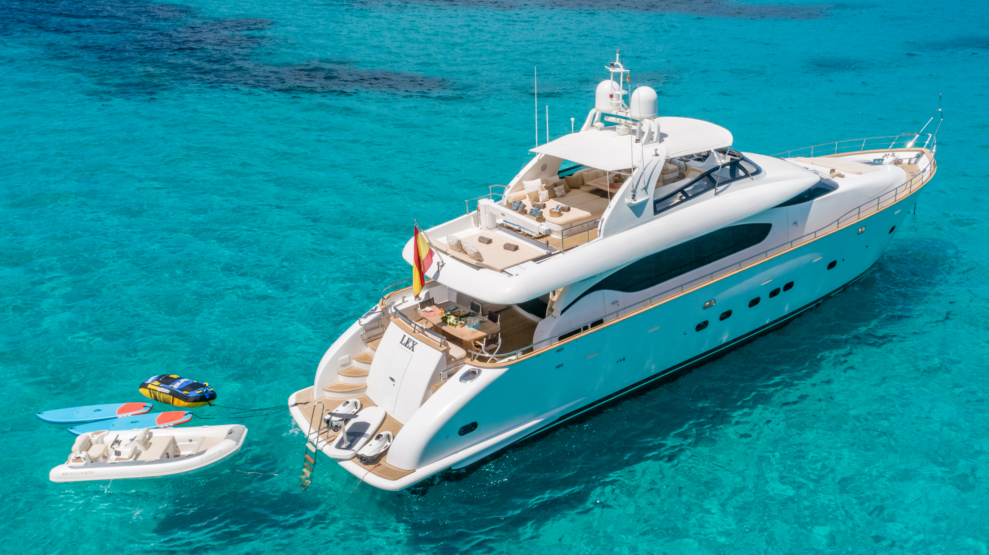 CRUISING AREA MY LEX is available for charter in Ibiza and Formentera, some of the most stunning and exclusive destinations in the Mediterranean. With a cruising speed of 15 knots, this yacht is perfect for discovering hidden beaches and anchoring in picturesque coves.