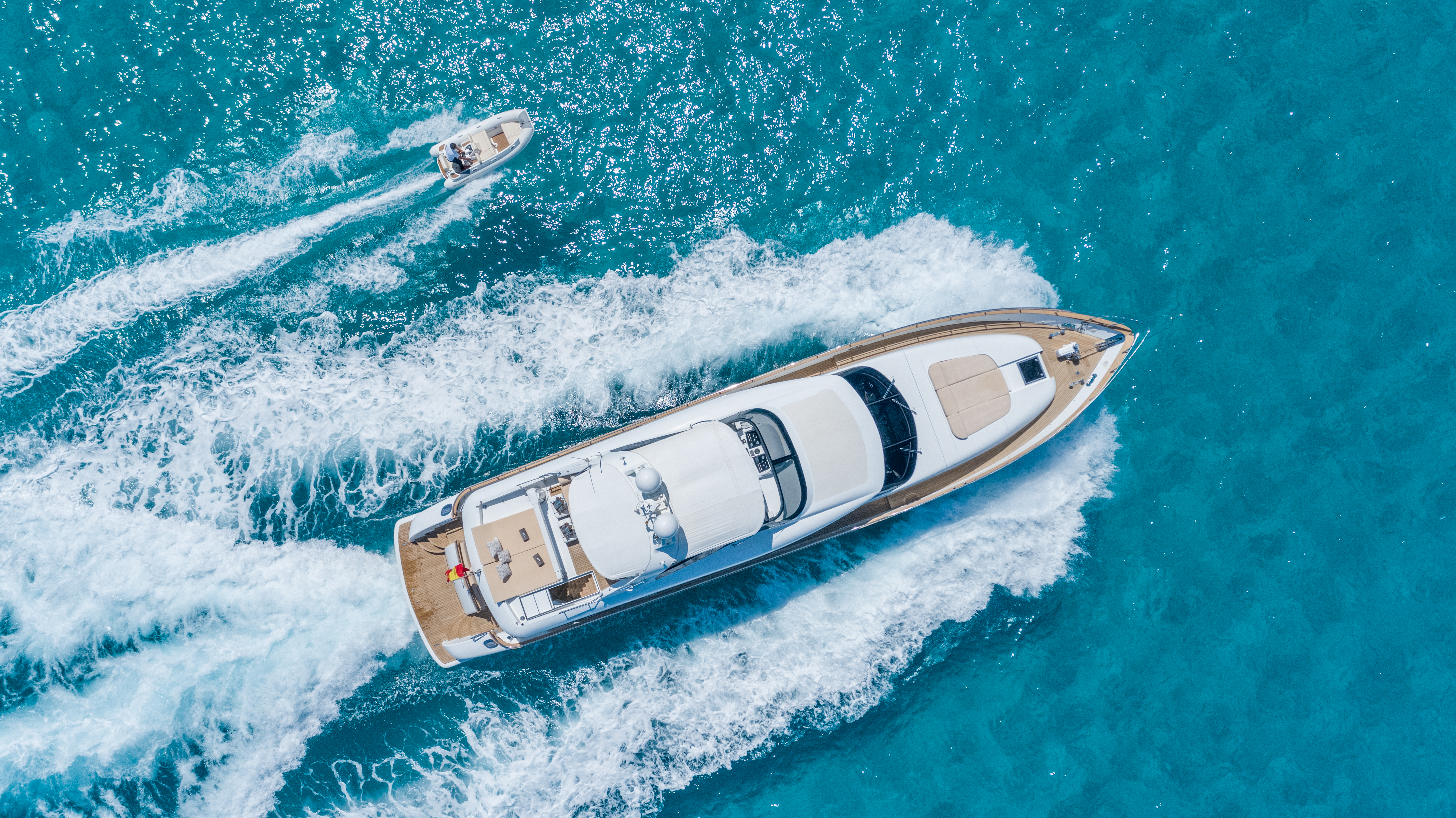 EXTERIORS The flybridge provides a sunbathing area, al fresco dining and a bar, perfect for enjoying the open air. The aft deck is ideal for outdoor meals, while the swim platform ensures easy access to the sea and water toys.