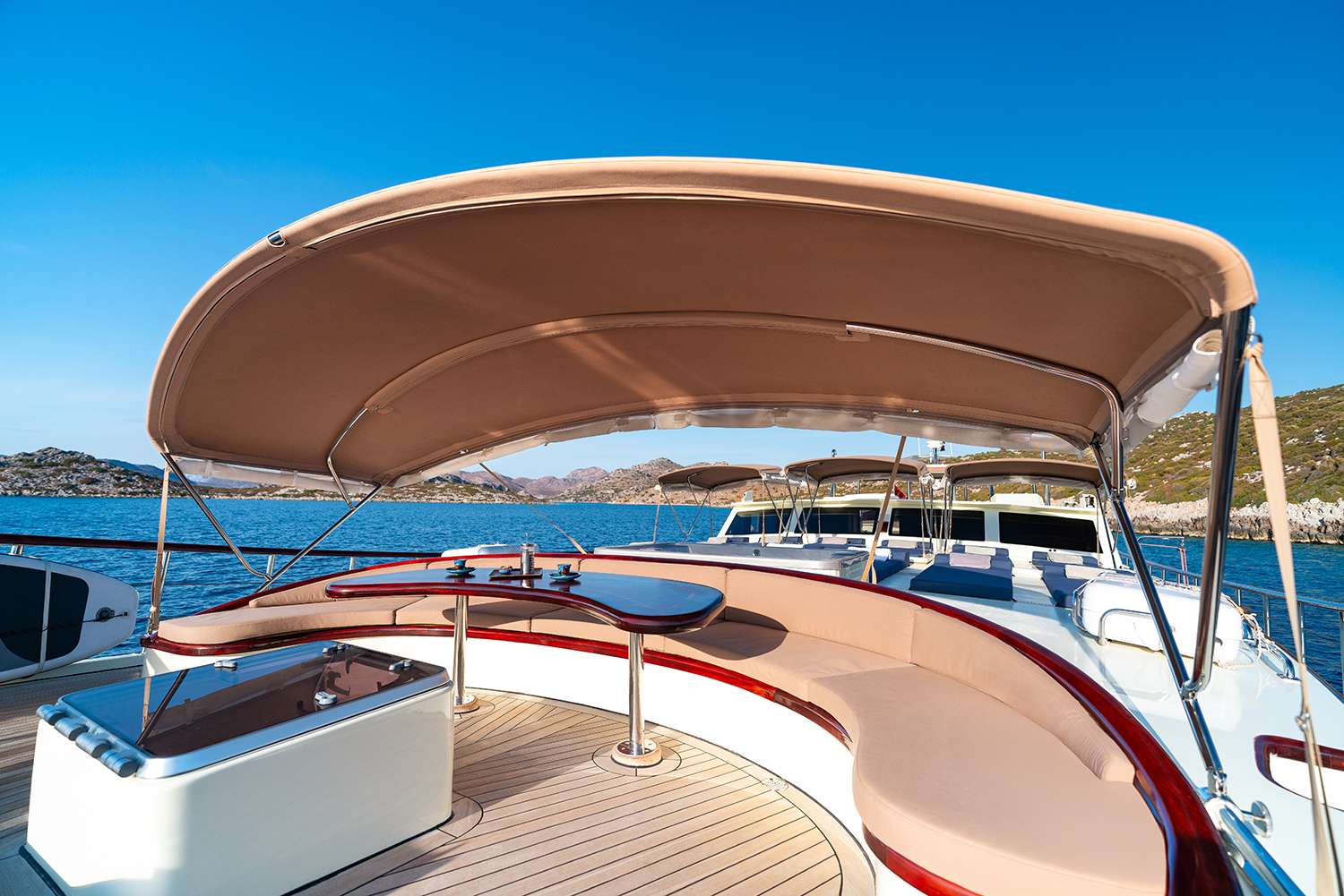 EXTERIORES La cubierta ofrece varias zonas para el relax y la socialización. En proa, una amplia área de solárium con colchonetas. En popa, zona de comedor al aire libre y salón exterior con vistas al mar. La plataforma de baño facilita el acceso al mar y al uso de juguetes acuáticos.