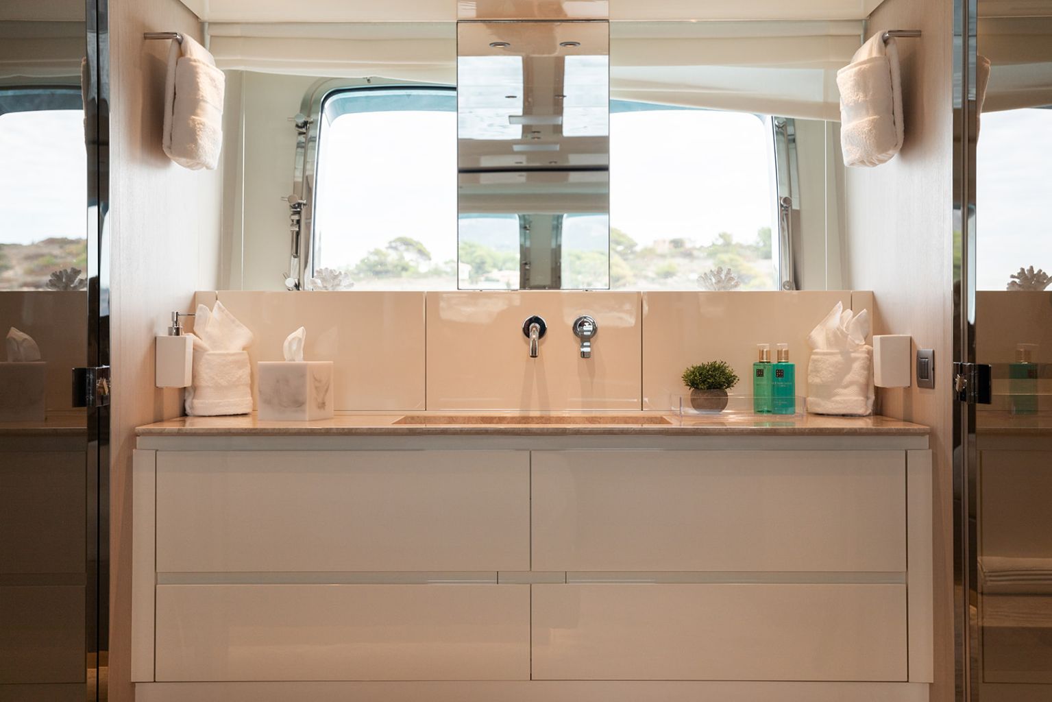 ALOJAMIENTO A BORDO El yate ofrece alojamiento para hasta 7 huéspedes en 3 comfortables cabinas: Camarote Principal: Cuenta con una cama doble, baño de planta abierta con ducha y un televisor, creando un ambiente sereno y sofisticado. Camarote VIP: Con cama doble, baño en suite y televisor, decorado en tonos cálidos y acogedores. Camarote Twin: Disponible en dos configuraciones; como cabina twin o con una cama doble y una cama Pullman adicional, ambas opciones con baño en suite. Para charter de día admite hasta 12 pasajeros.