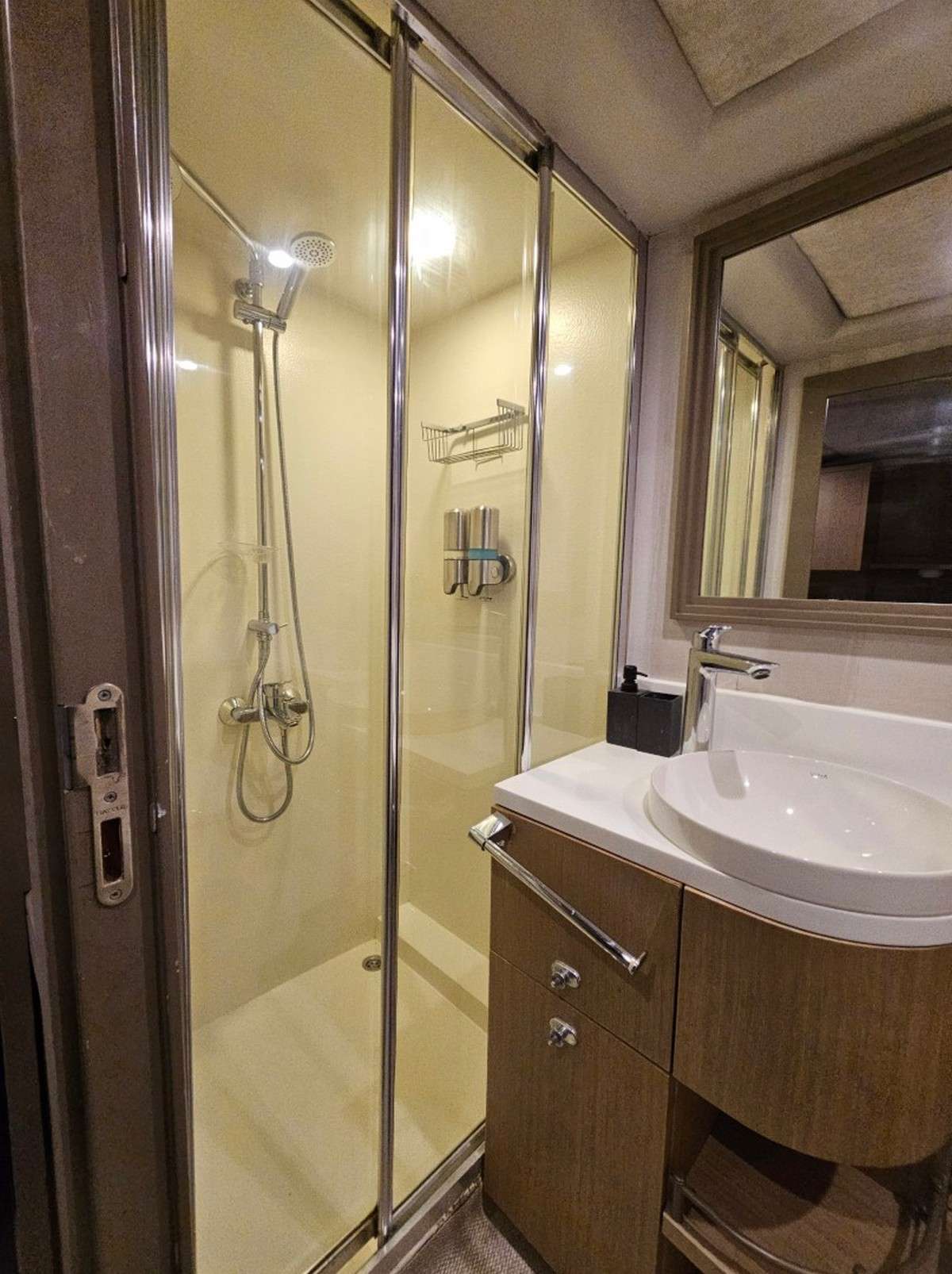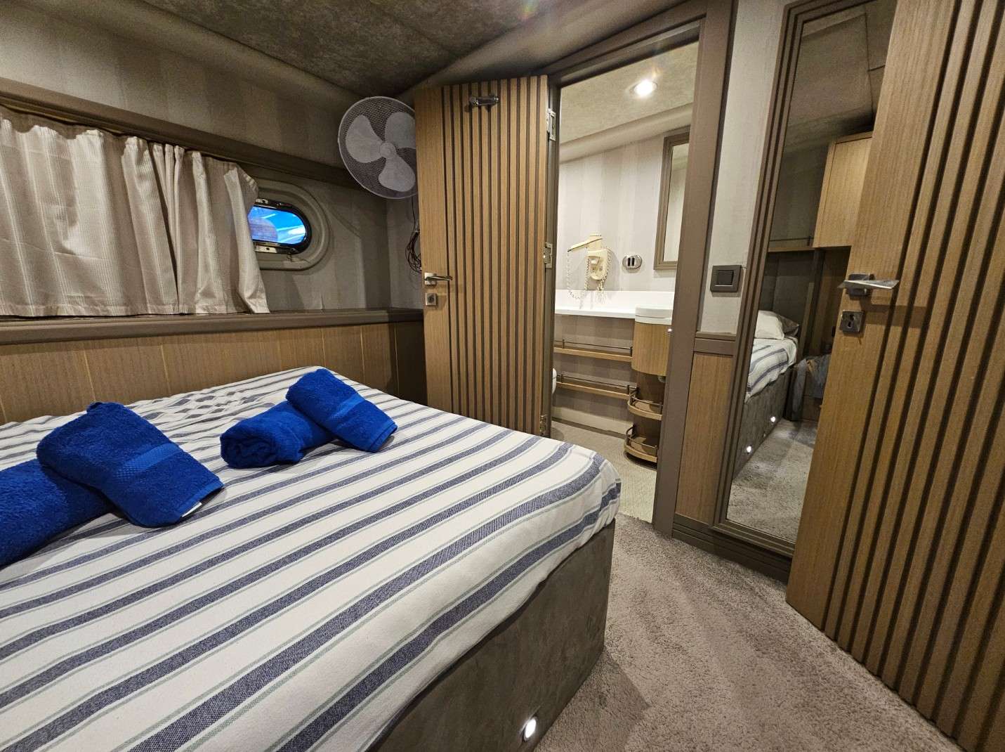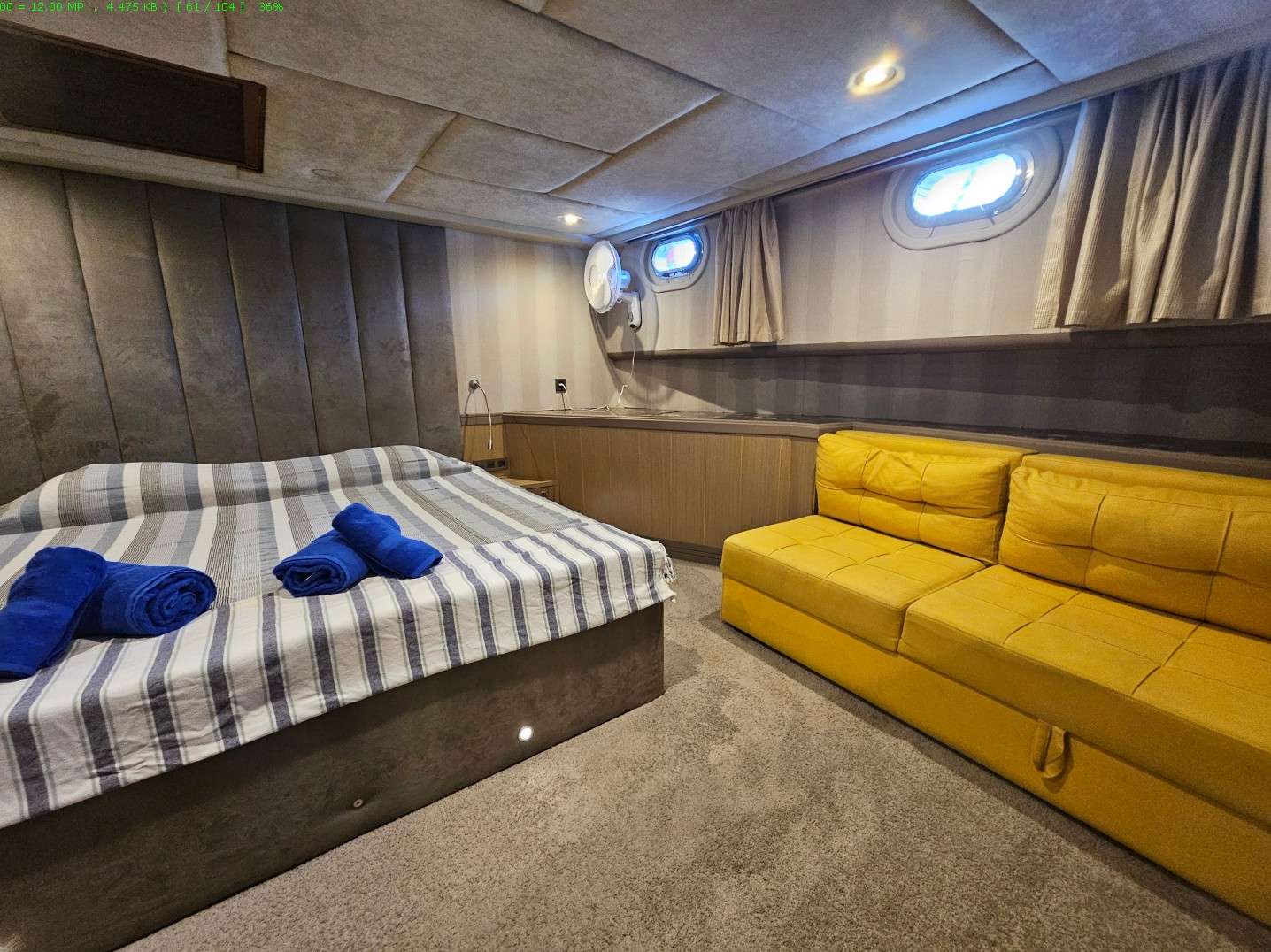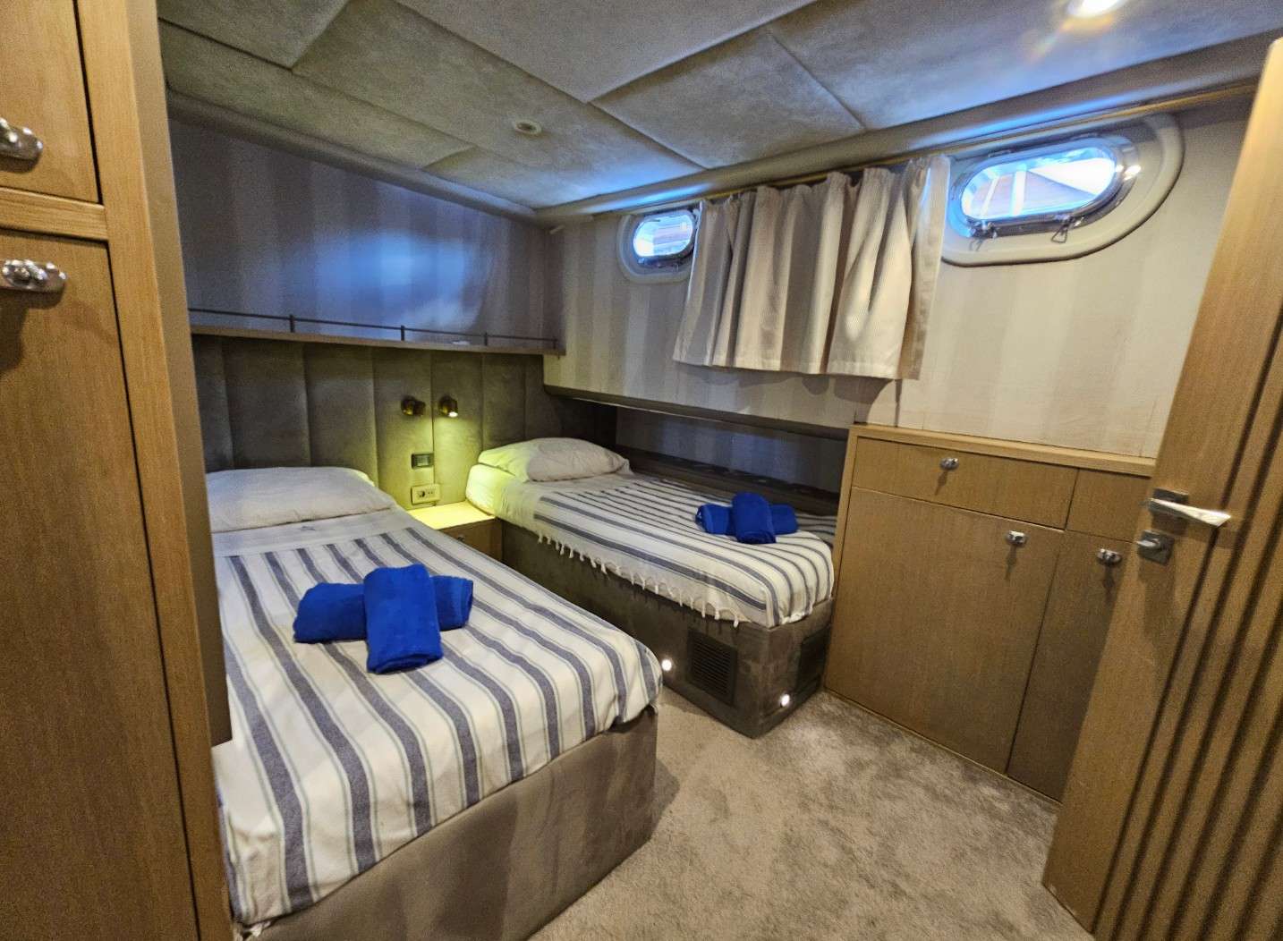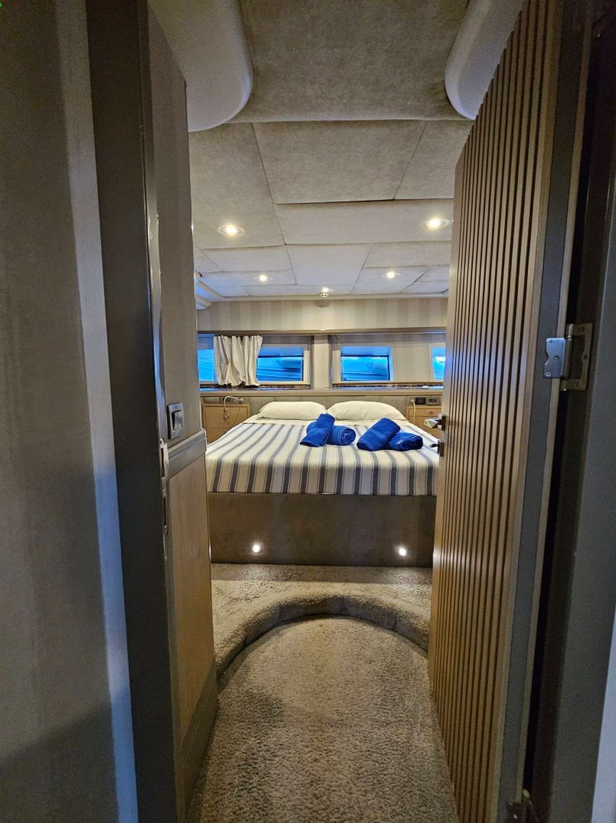 ALOJAMIENTO A BORDO El yate ofrece alojamiento para hasta 11 huéspedes en 5 cómodos camarotes. La distribución incluye 2 camarotes Master (uno en proa y otro en popa), 2 camarotes dobles adicionales y 1 camarote twin, perfecto para grupos de amigos o familias. Cada camarote dispone de su propio baño, con aire acondicionado en todo el barco.