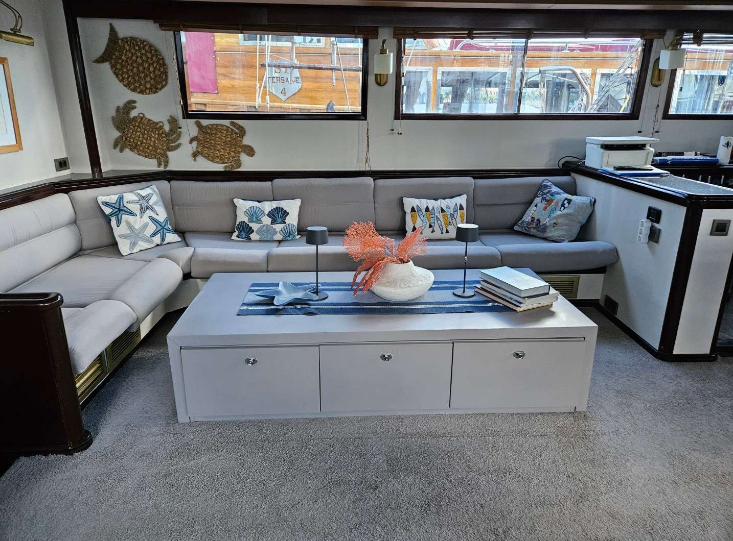 INTERIORES El interior de DREAM A ofrece un ambiente acogedor y funcional. El salón está equipado con cómodos sofás, comedor, y ofrece un diseño que permite disfrutar tanto del relax como de la convivencia. Las grandes ventanas proporcionan luminosidad natural y vistas al mar desde cualquier ángulo.