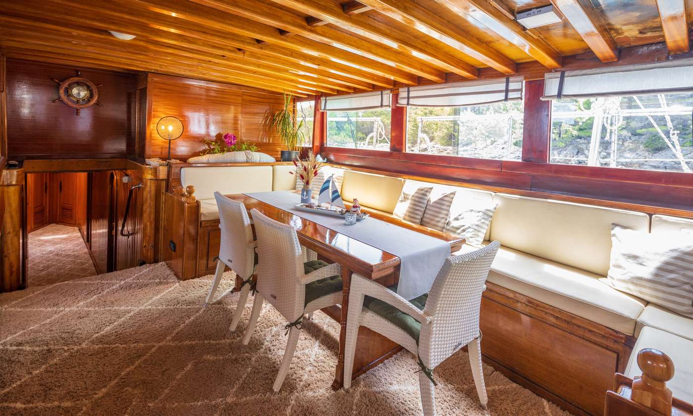 INTERIORES GIDEON destaca por su diseño funcional y acogedor. Sus amplios espacios interiores incluyen una zona de salón y comedor donde los huéspedes pueden relajarse en un ambiente informal y elegante. Gracias a su reciente refit, los interiores han sido renovados para ofrecer una experiencia aún más confortable.