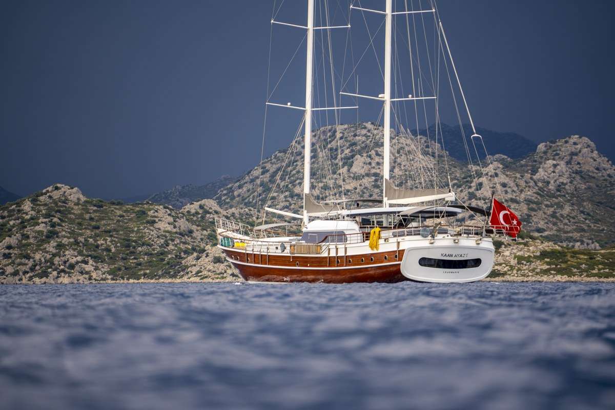 EXTERIORES El exterior de KAAN AYAZ se compone de una cubierta de teca con múltiples zonas para relajarse. Dispone de comedor al aire libre con sombra, solárium con colchonetas, ducha exterior, barbacoa y escalera de baño. Además, cuenta con jarcia y velas para quienes deseen una experiencia de navegación tradicional.