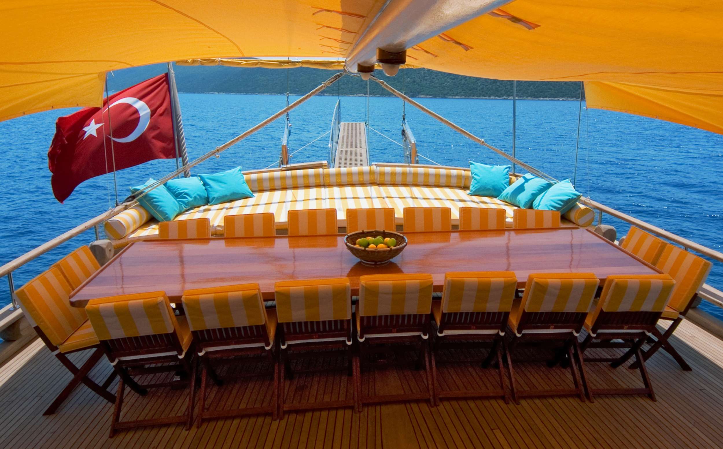 TRIPULACIÓN La tripulación de 5 profesionales, liderada por el Capitán Orhan Topcu, garantiza una experiencia a bordo atenta y segura. El equipo incluye chef, marinero, anfitrión/barman y encargada de limpieza. Hablan inglés y turco, y se aseguran de que cada invitado reciba un servicio personalizado.