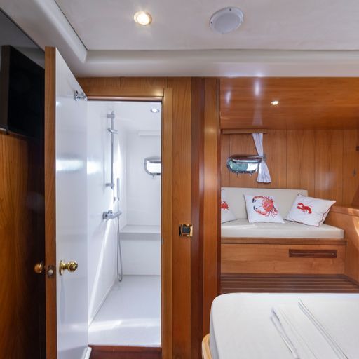 COMODIDADES Y ENTRETENIMIENTO Esta goleta de alquiler cuenta con aire acondicionado en todos los camarotes. Para el entretenimiento de niños y mayores tiene una amplia selección de juguetes acuáticos tales como: 2 Canoas, un donut arrastrable con la barca auxiliar, 1 tabla de Paddle Surf, Equipo de snorkel, Equipo de pesca y buceo.