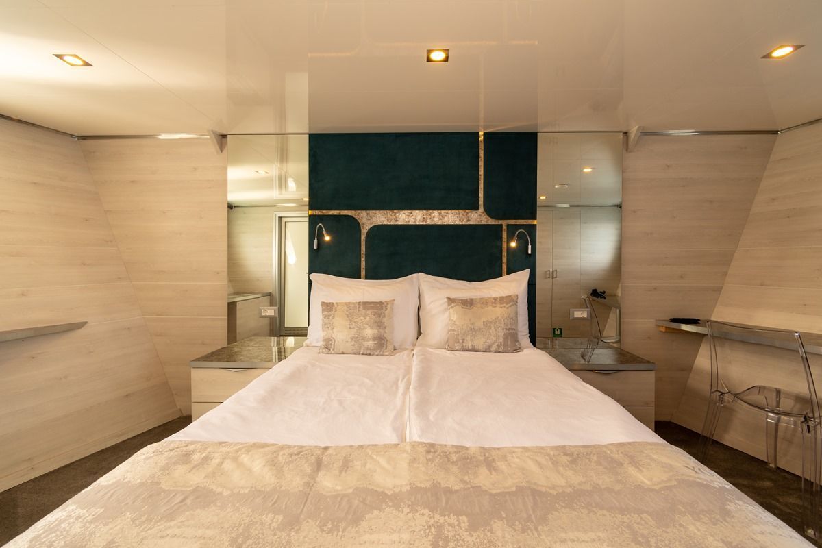 ALOJAMIENTO A BORDO El yate puede alojar hasta 30+2 invitados en 15 camarotes con baño privado, todos con aire acondicionado. En la cubierta inferior se encuentran 2 camarotes triples, 4 dobles y 2 convertibles con camas individuales, todos con amplias ventanas y vistas espectaculares al mar. En la cubierta principal se distribuyen 7 camarotes dobles con baño privado, proporcionando un alojamiento confortable y privado para cada huésped.