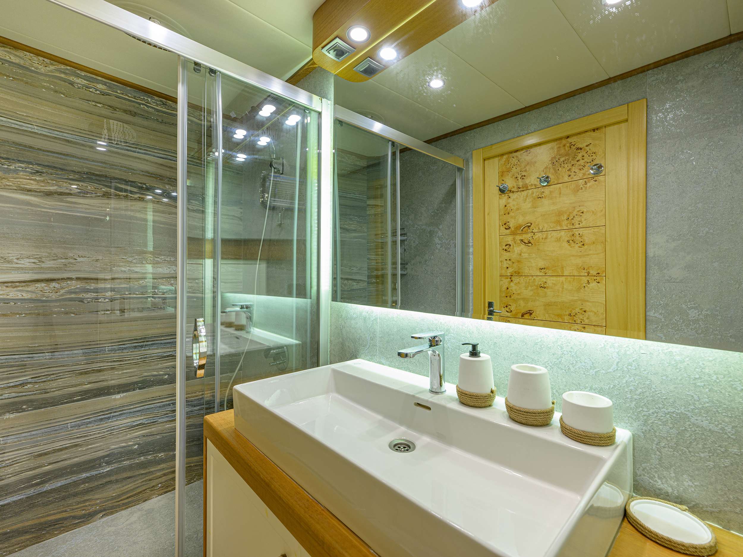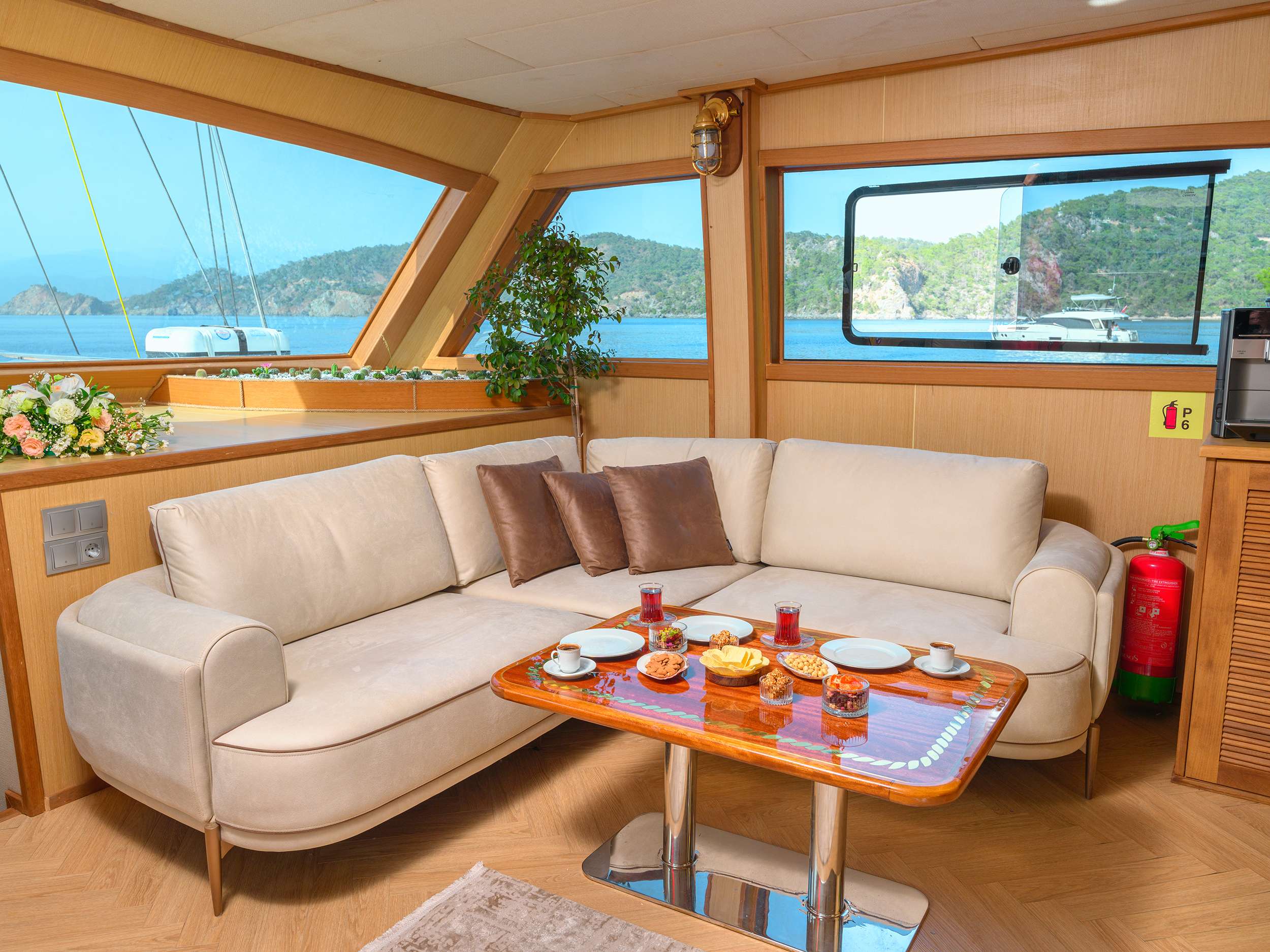 INTERIORS BELGIN SULTAN features timeless elegance and a warm ambience. The main salon offers a comfortable seating area and indoor dining space with large windows providing natural light. Natural wood finishes, soft colours and subtle lighting create a refined and relaxing environment, perfect after a day at sea.