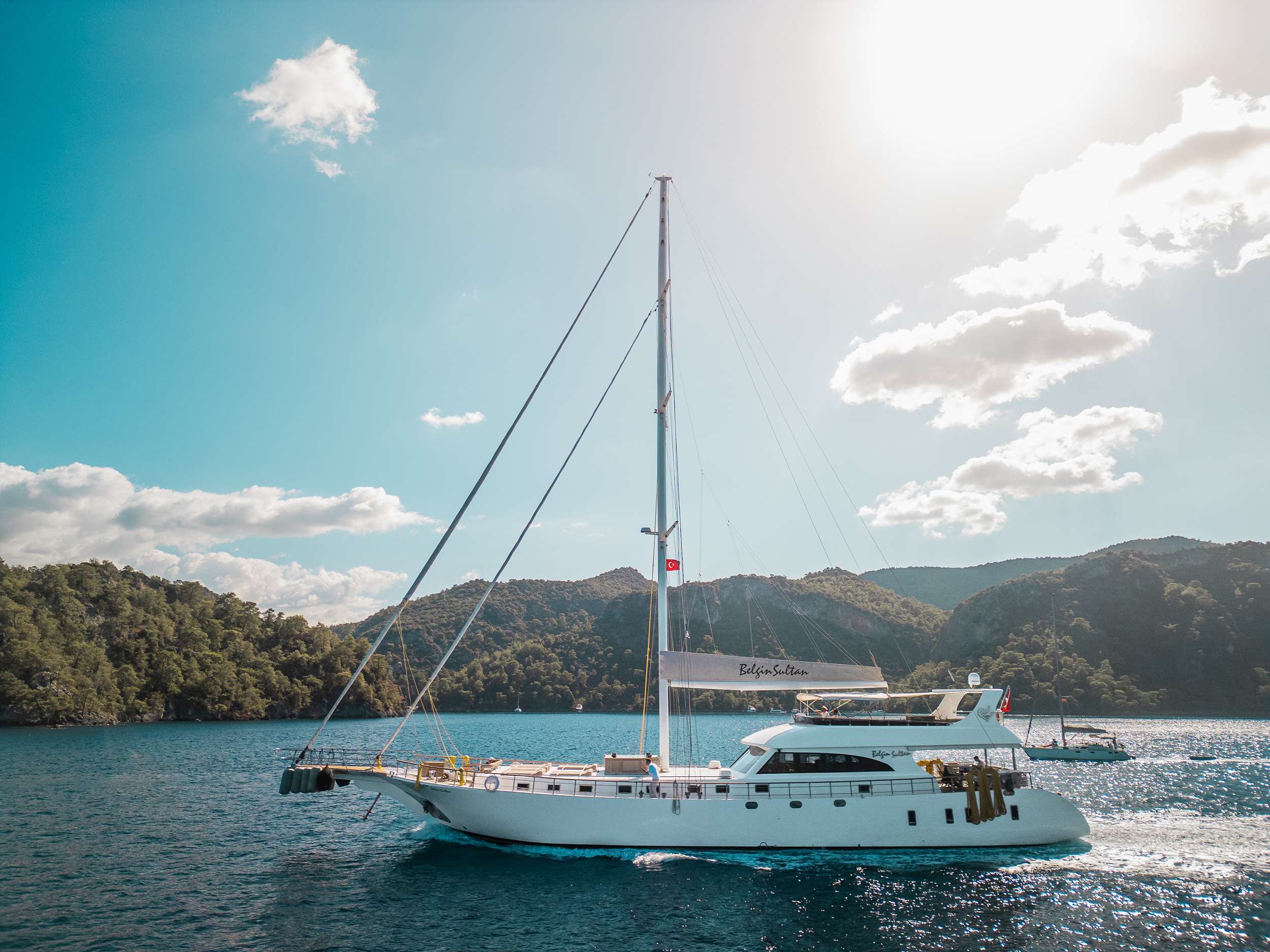 CRUISING AREA BELGIN SULTAN cruises along the spectacular Turkish coast, exploring both the Aegean and Mediterranean waters. From Fethiye or other ports, guests can discover hidden bays, ancient ruins, untouched beaches and charming coastal towns. Cruising comfortably at 8 to 11 knots, she is ideal for an exclusive Turkish blue cruise combining culture, gastronomy and relaxation.
