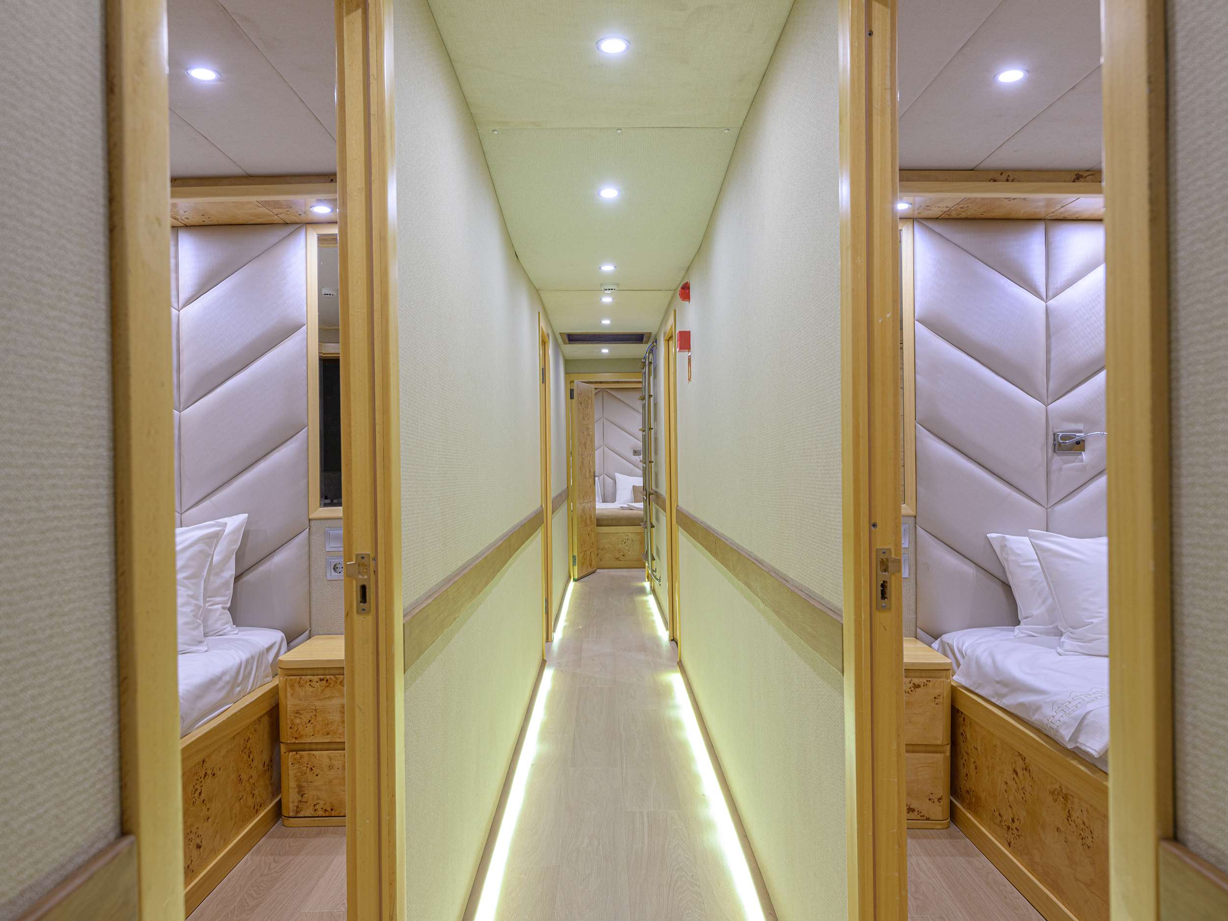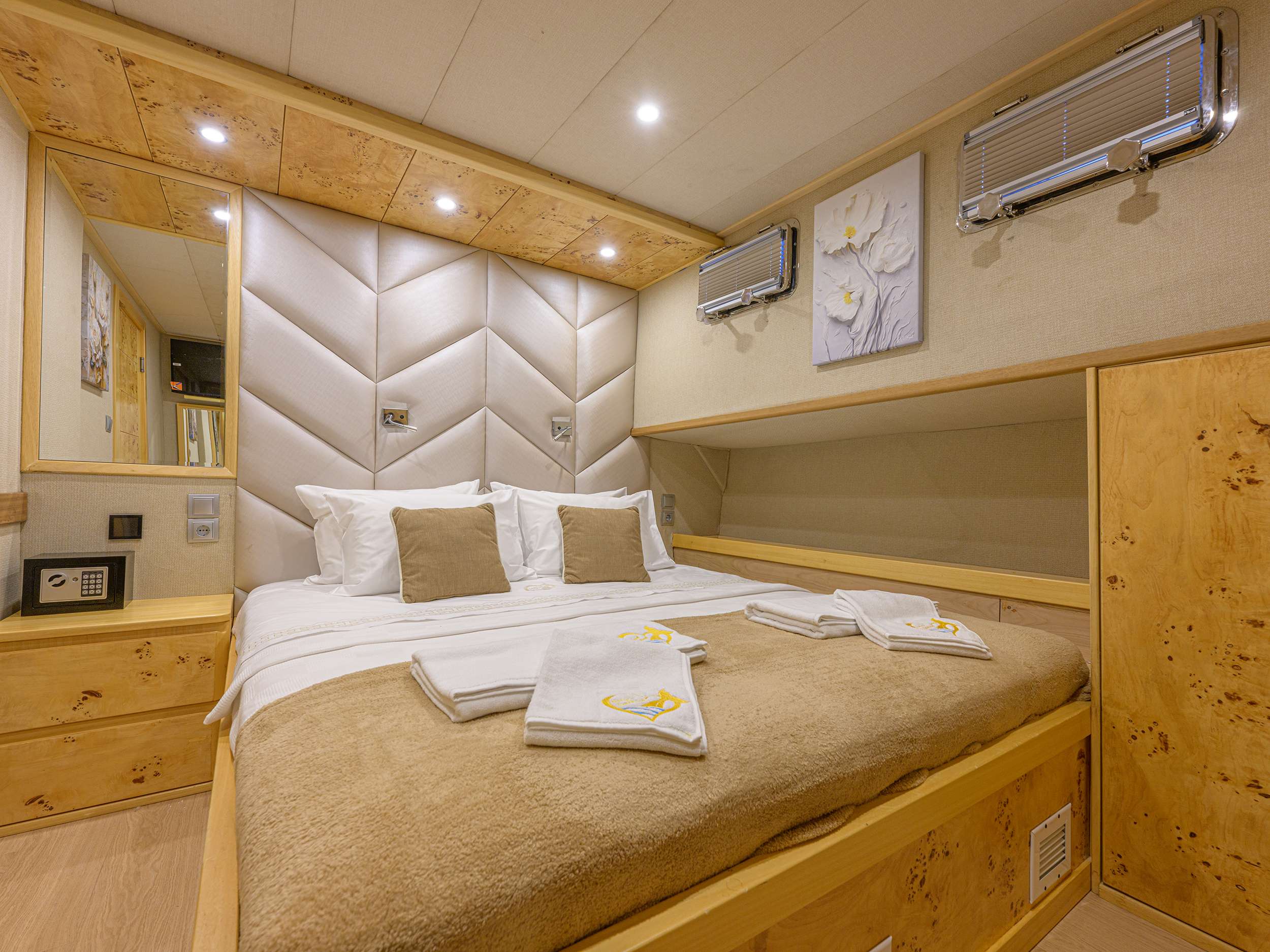 ACCOMMODATION ON BOARD She accommodates up to 10 guests in 5 cabins, all with en-suite bathrooms, shower box and electric toilet. Master Cabin: Spacious 15 m² master cabin with double bed (195 x 175 cm) and private bathroom. Double Cabins: Four double cabins of 9.5 m² each, all with double bed (195 x 175 cm) and private bathroom. All cabins are air-conditioned and designed in warm tones and natural wood to create a welcoming and elegant atmosphere.