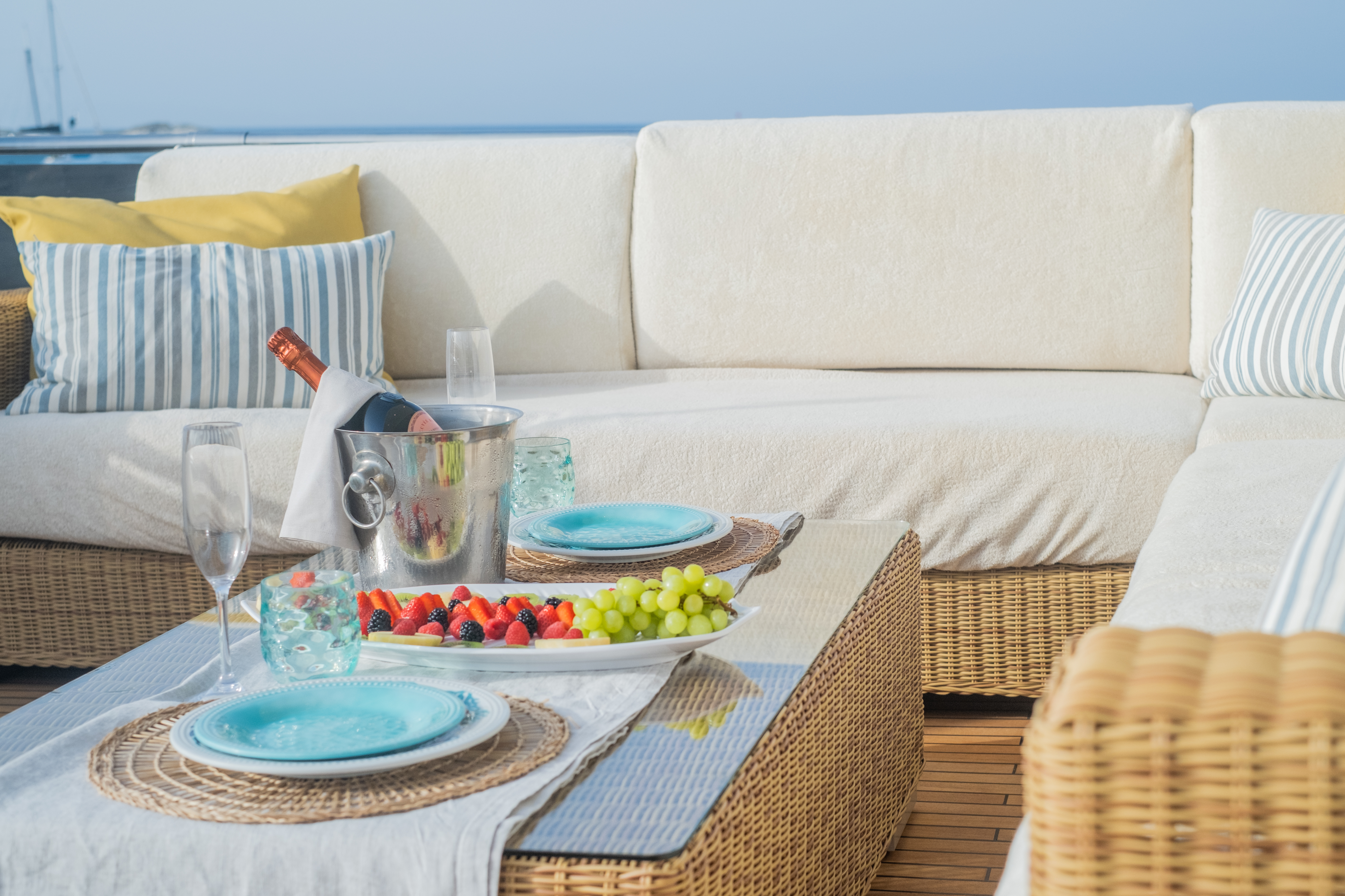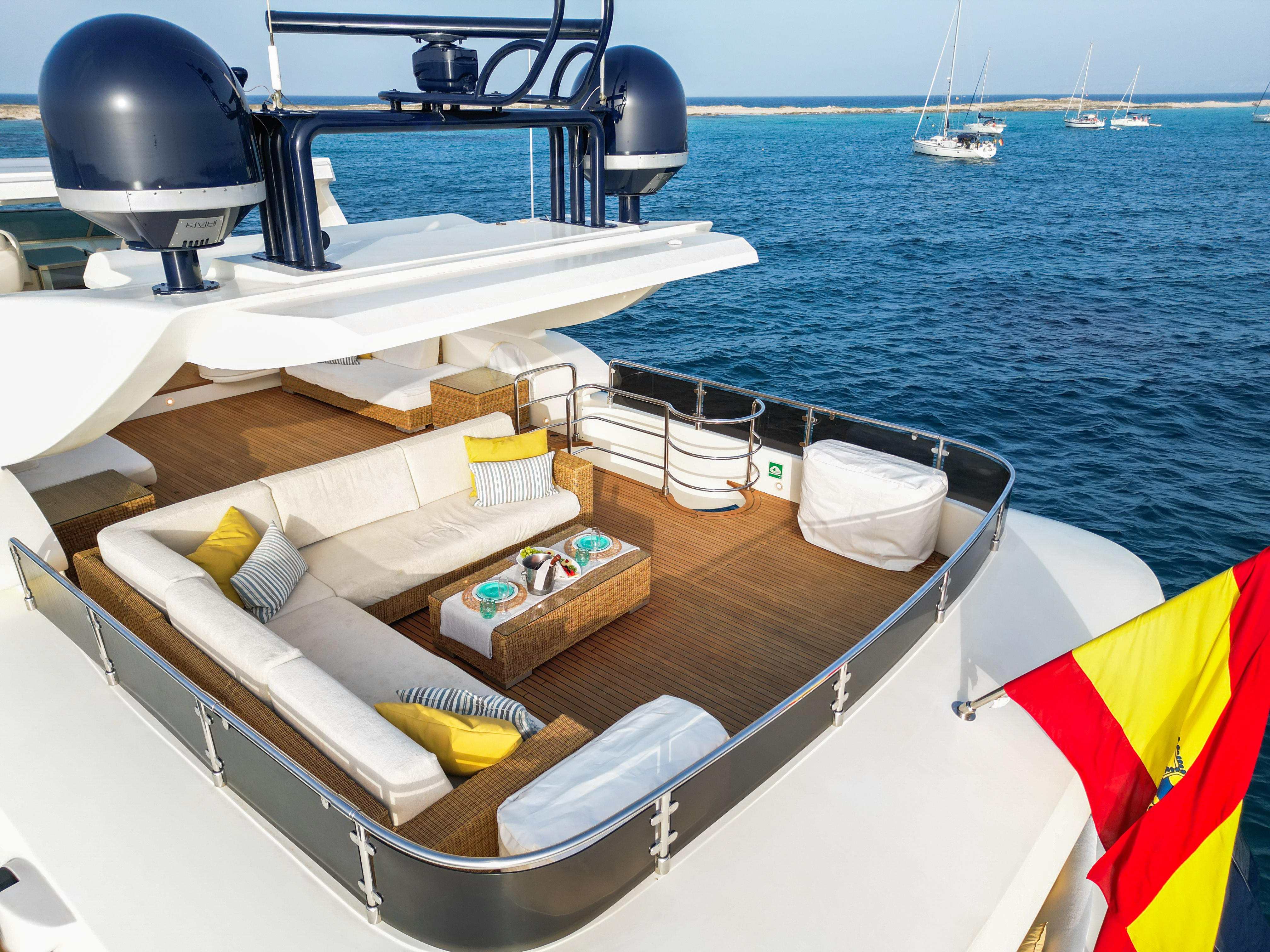 EXTERIOR Outdoors, the yacht offers a spacious flybridge with seating, sunbathing area and al fresco dining. The aft deck features a large dining table and the swim platform provides easy access to the sea. The bow area is perfect for relaxing or enjoying the views while cruising.