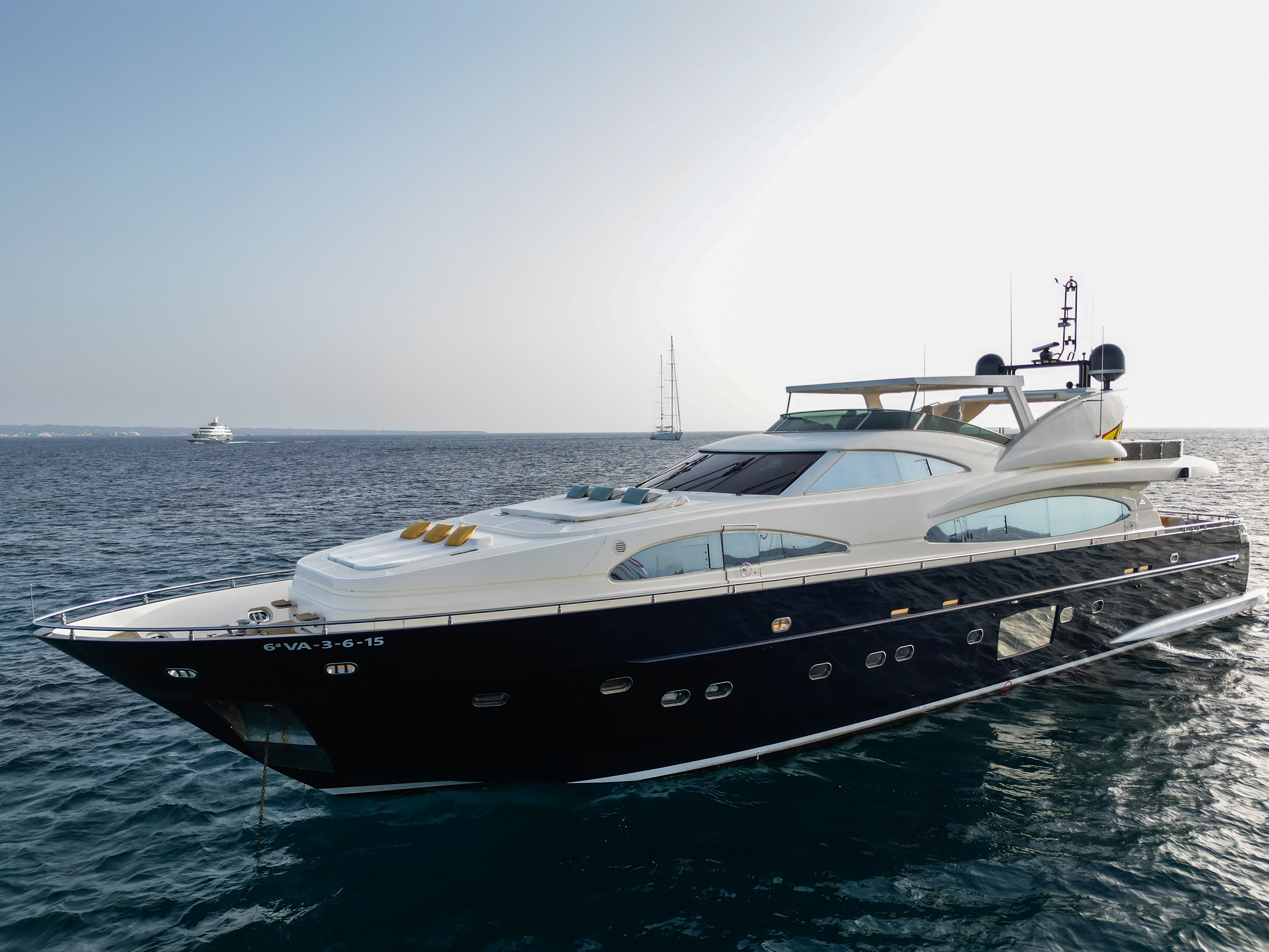 CRUISING AREA ASTONDOA 102 GLX is available for charter in the Balearic Islands, one of the most coveted destinations in the Mediterranean. With its stabilizers for navigation and anchoring, it ensures a smooth ride and exceptional comfort. It cruises at 16 knots powered by twin MTU engines of 2,000 HP each.