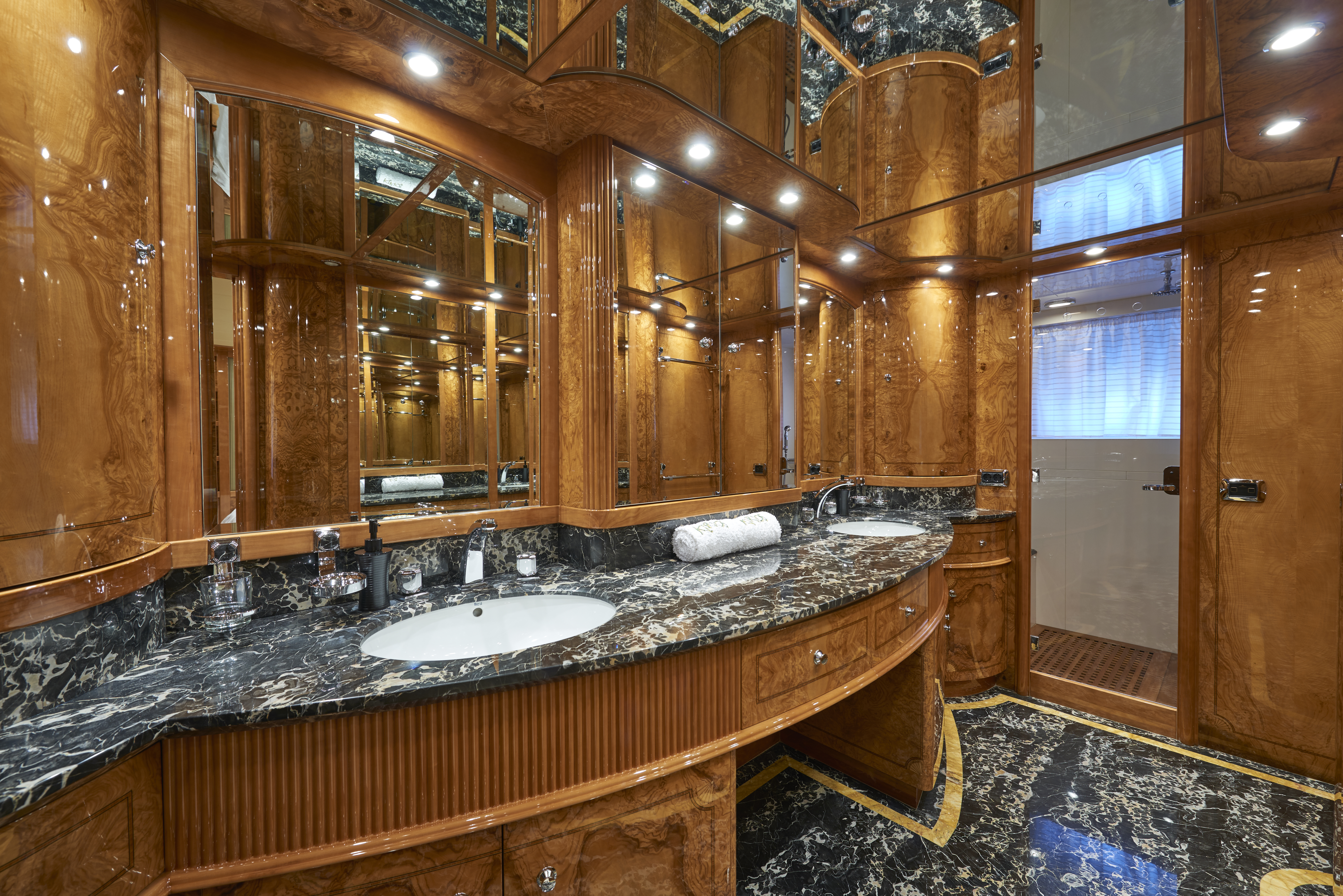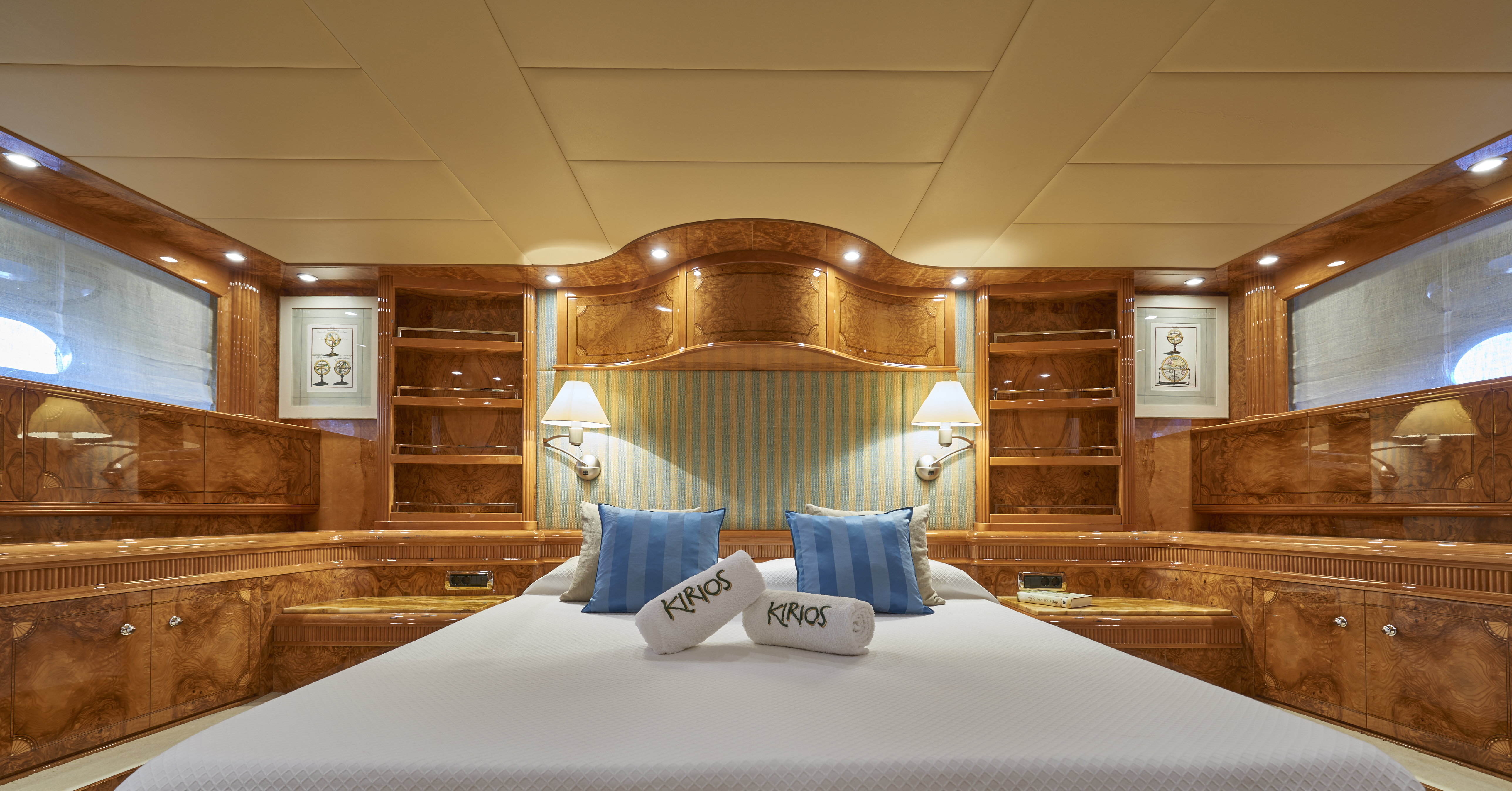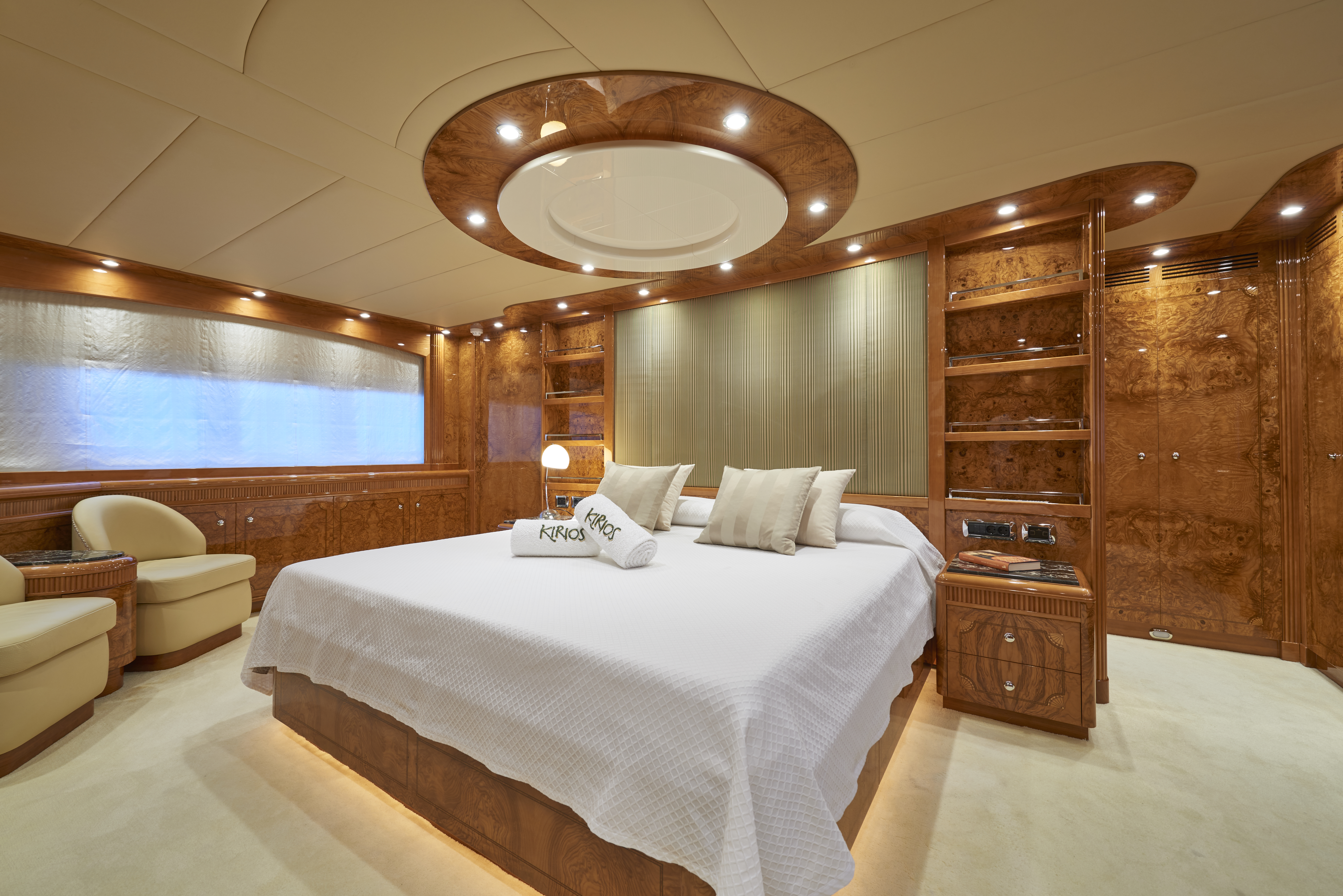 INTERIOR MY KIRIOS features timeless, elegant interiors with rich woods, marble, and plush furnishings. The main salon offers panoramic views, a formal dining area and a cozy lounge. The overall ambiance is serene and luxurious, ensuring a first-class experience onboard.