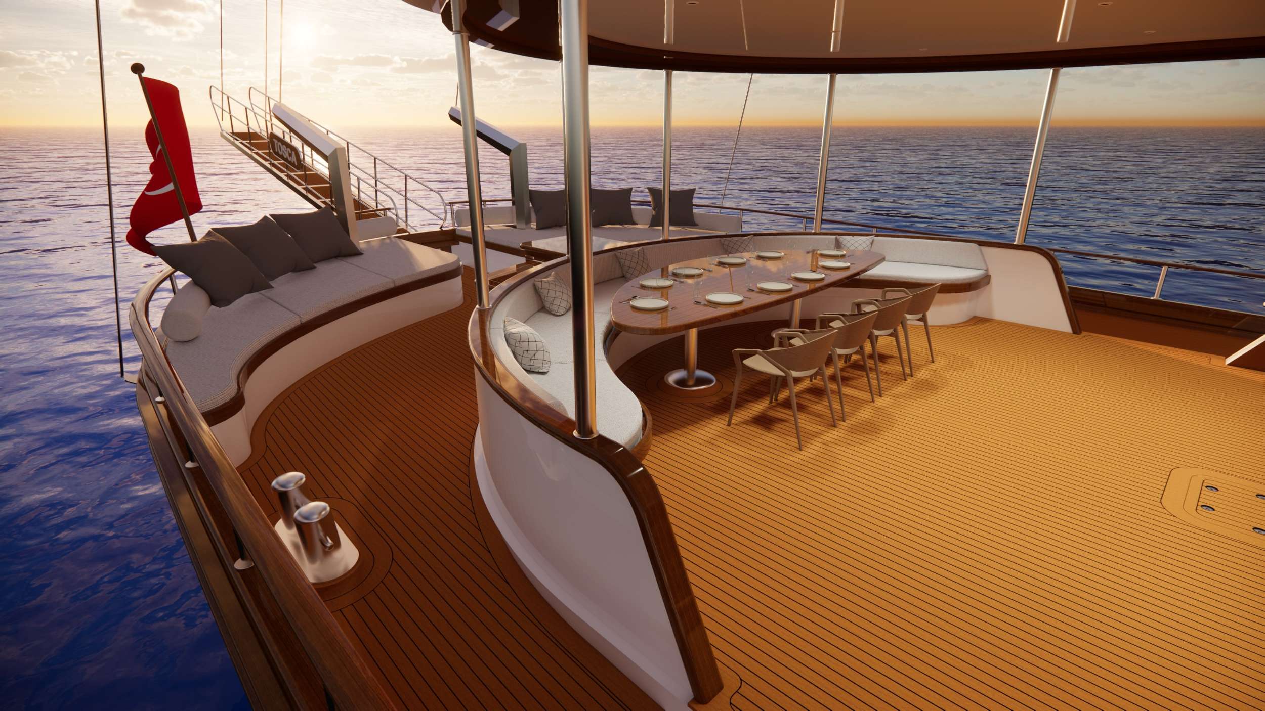 EXTERIORS Life on board TOSCA is best enjoyed outdoors. The spacious aft deck features a large dining table and bar area, perfect for long Mediterranean dinners and sunset cocktails, with the option of shade when required. At the bow, comfortable sunbeds and a shaded bimini area invite guests to relax while admiring panoramic sea views. Her generous deck spaces ensure privacy, tranquillity and the pleasure of slow cruising.