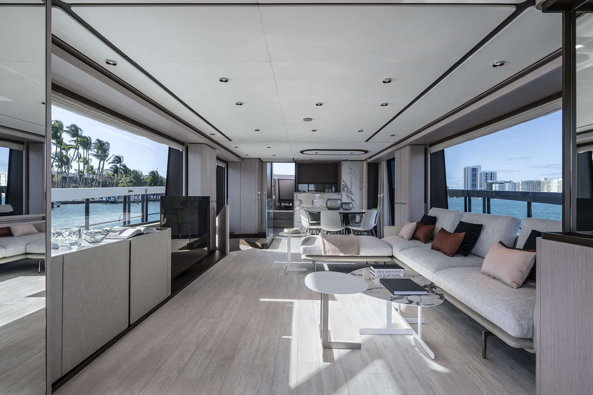 INTERIORES Los interiores destacan por su diseño moderno, luminoso y minimalista, con amplios ventanales que ofrecen vistas panorámicas al mar. El salón principal combina una zona de comedor y un espacio lounge sofisticado, creando un ambiente perfecto para relajarse o socializar en un entorno elegante.