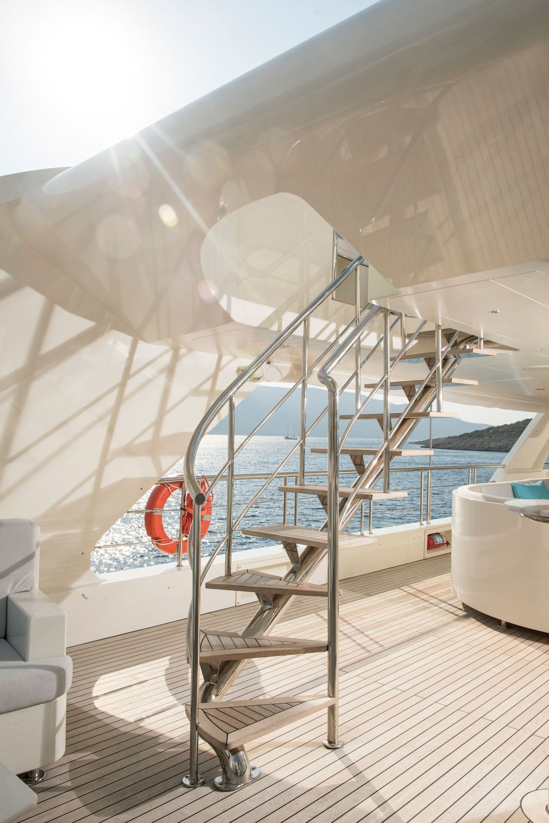 EXTERIORES En cubierta, MEIRA cuenta con zonas amplias para el solárium, un jacuzzi en el flybridge, lounge al aire libre, comedor exterior y plataforma de baño hidráulica. El spa incluye sauna y sala de masajes, para un nivel de bienestar excepcional.