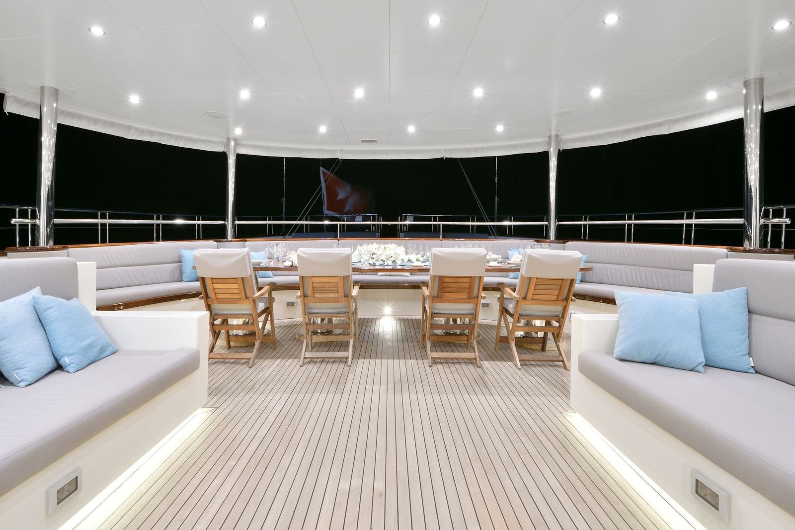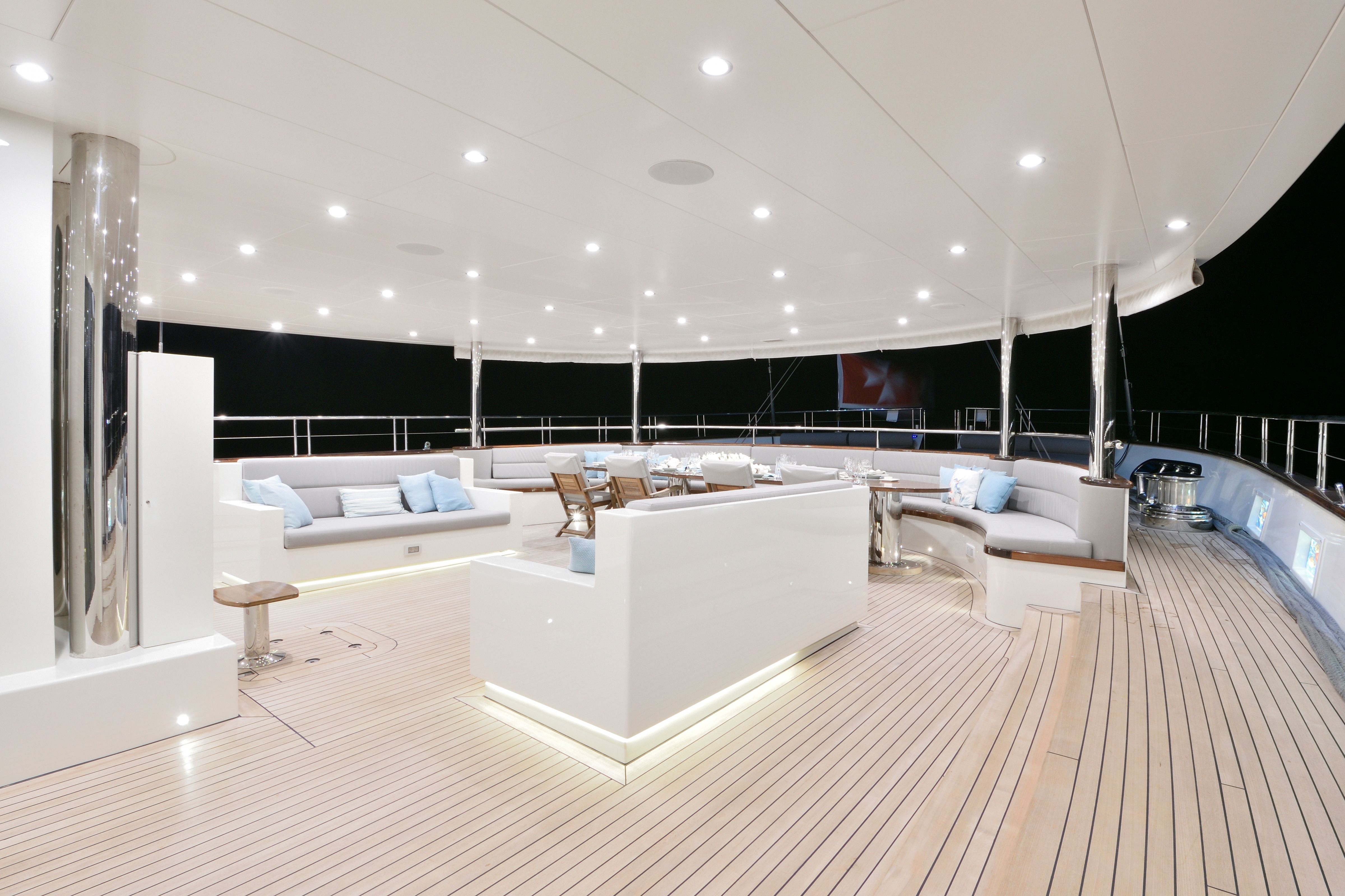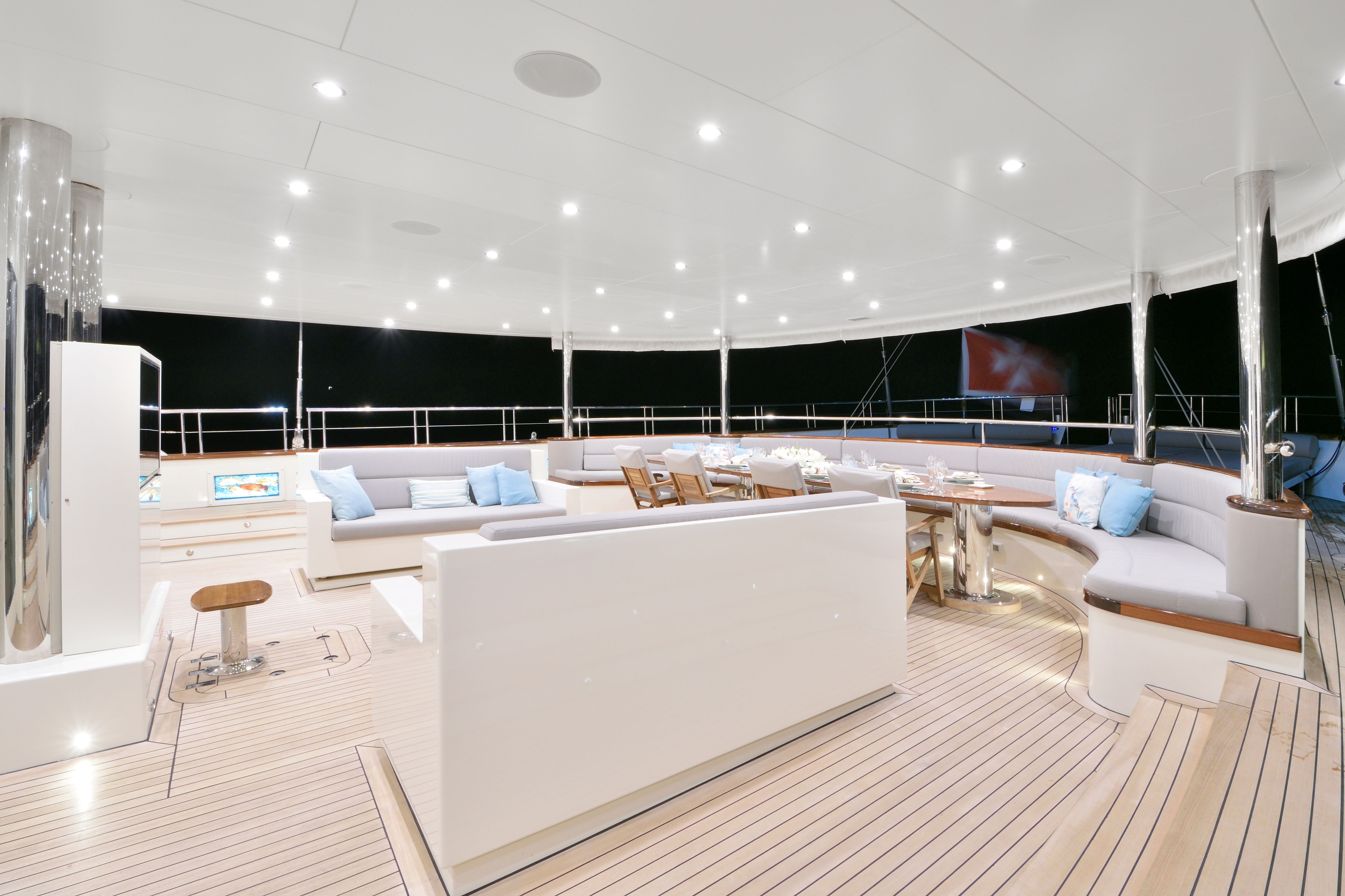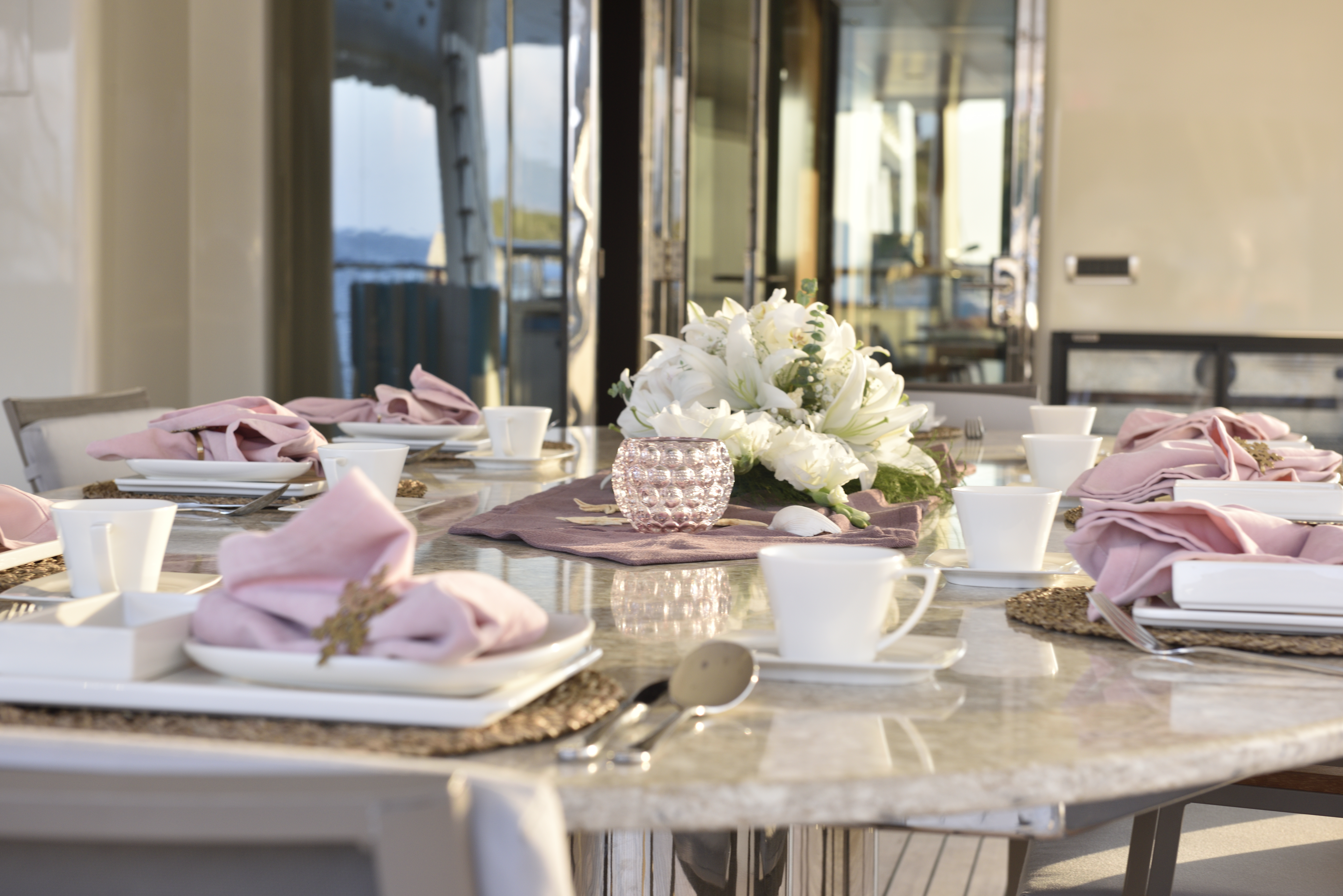 INTERIORES Los interiores de MEIRA destacan por su diseño firmado por Evan K. Marshall, que combina sofisticación con funcionalidad. El salón principal en la cubierta principal ofrece amplios ventanales, zona de comedor formal y cómodos sofás, creando un ambiente elegante y relajado a la vez.