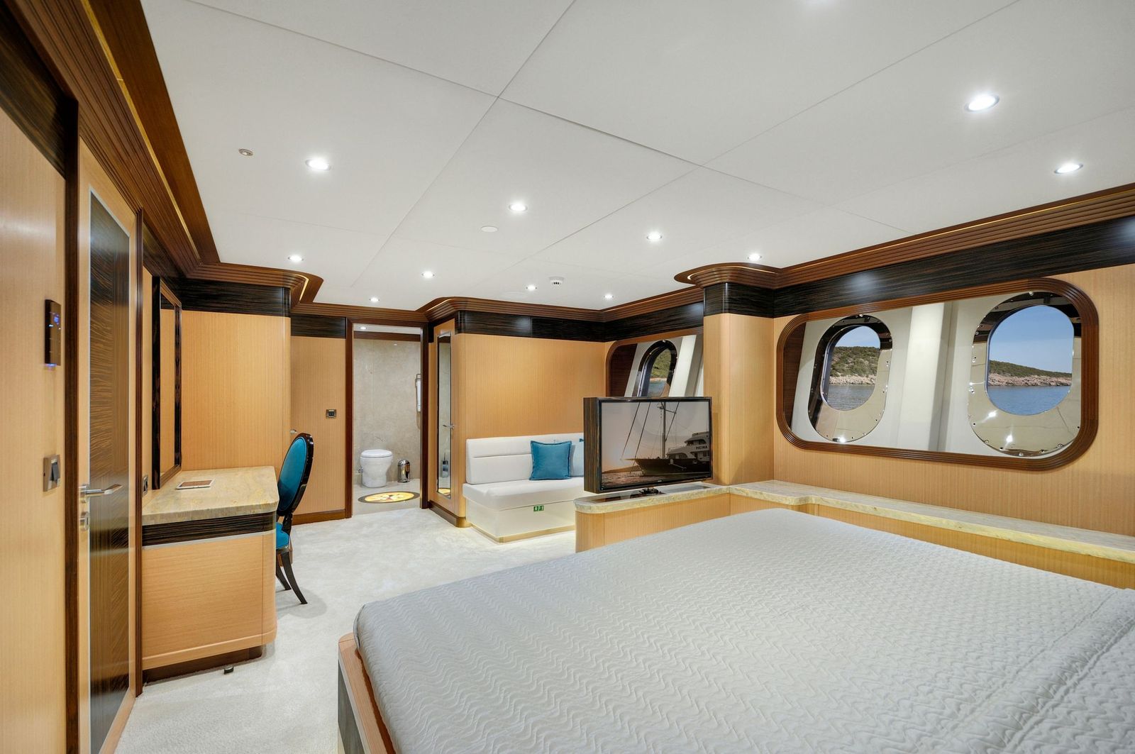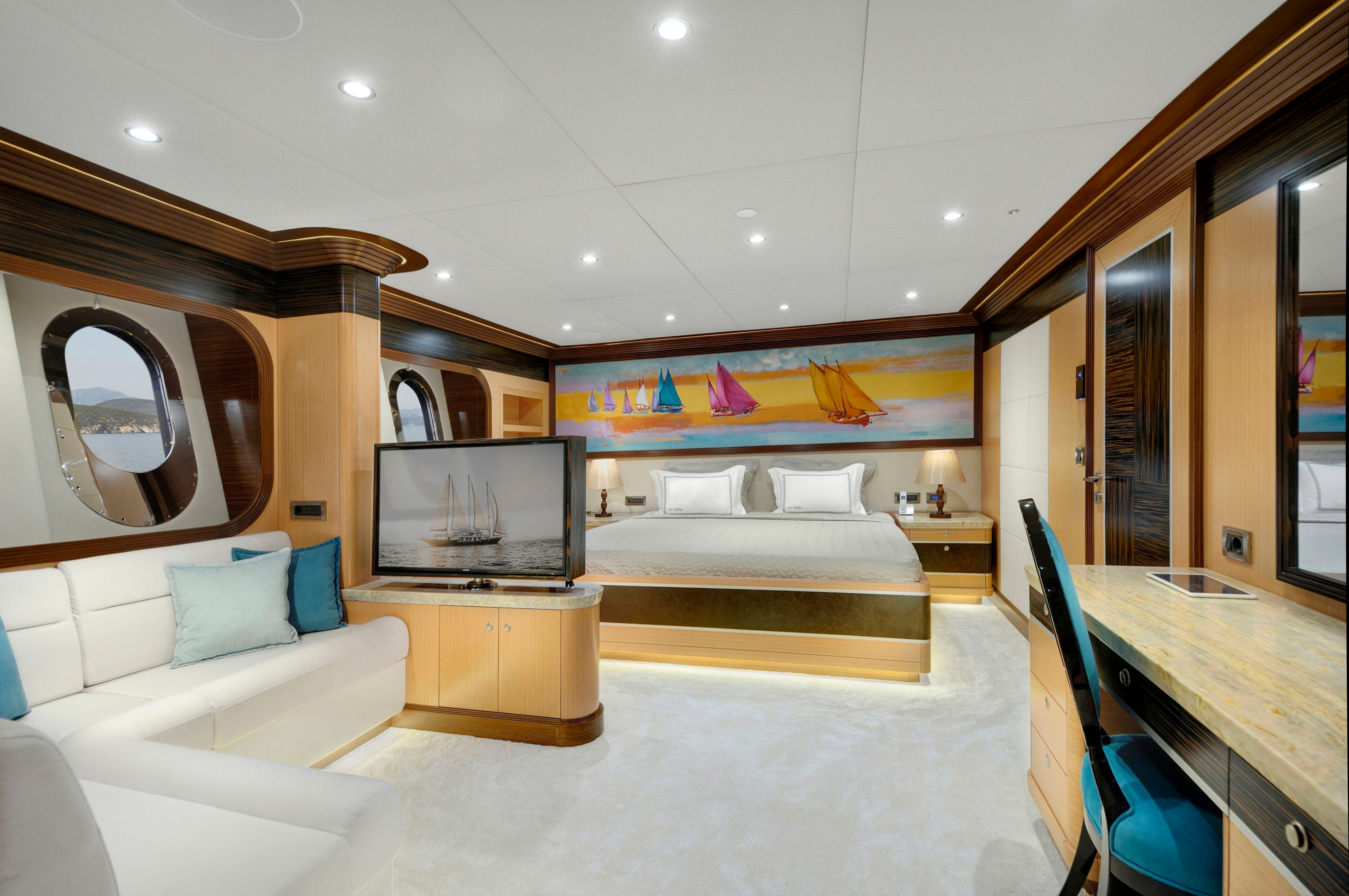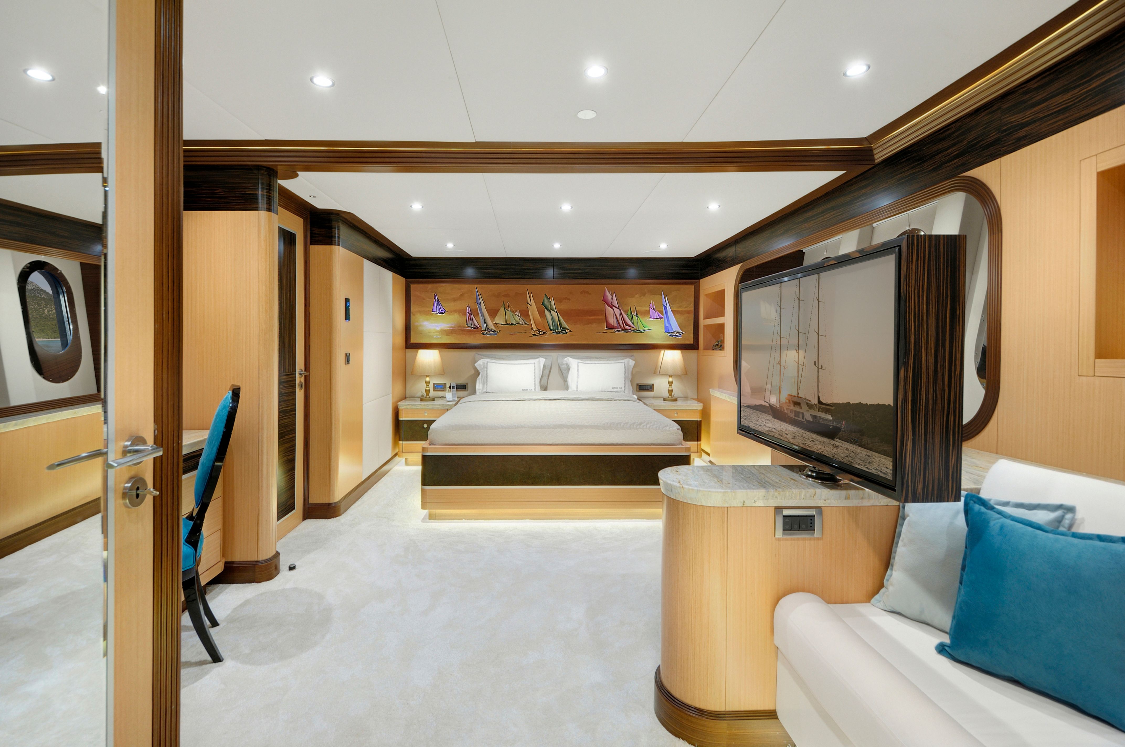 ALOJAMIENTO A BORDO El yate ofrece alojamiento para hasta 12 personas en 6 lujosos camarotes: 1 Master suite en la cubierta principal con cama king size, 3 camarotes VIP con camas matrimoniales, y 2 camarotes gemelos que pueden configurarse como camas individuales o como cama doble, todos con baño en suite, sistema de domótica, aire acondicionado y acabados de alta gama.
