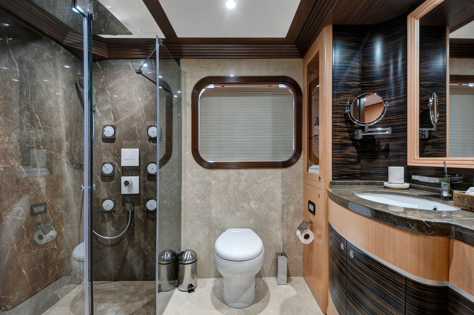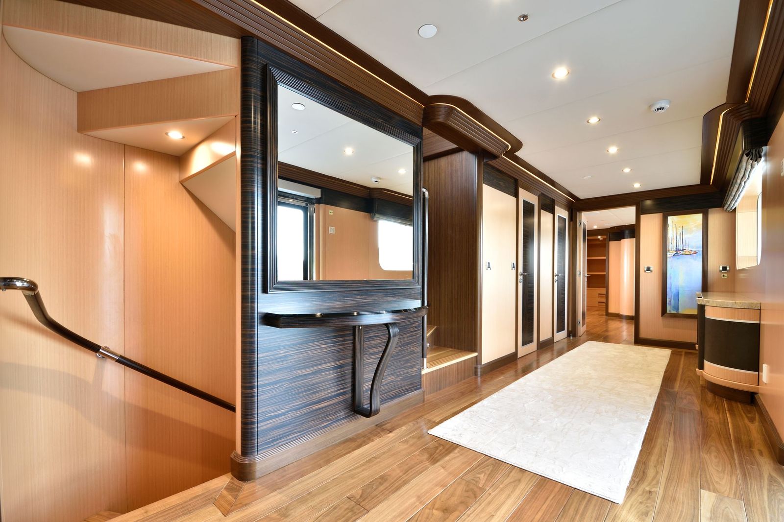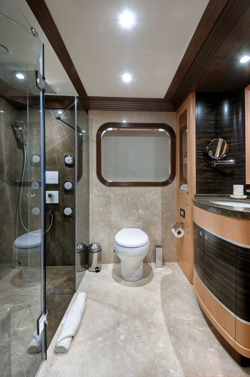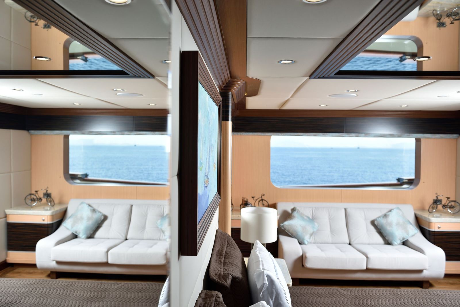 ALOJAMIENTO A BORDO El yate ofrece alojamiento para hasta 12 personas en 6 lujosos camarotes: 1 Master suite en la cubierta principal con cama king size, 3 camarotes VIP con camas matrimoniales, y 2 camarotes gemelos que pueden configurarse como camas individuales o como cama doble, todos con baño en suite, sistema de domótica, aire acondicionado y acabados de alta gama.